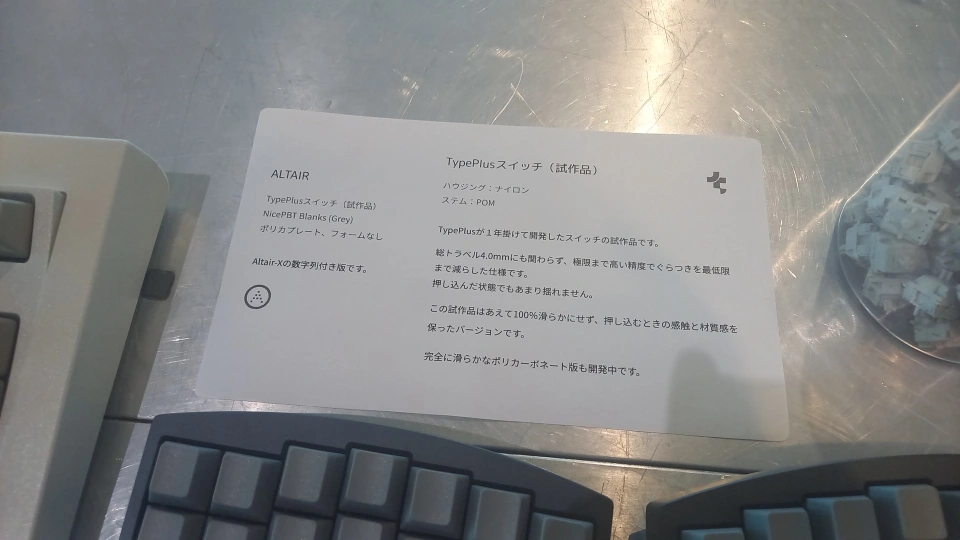 Dryの状態で展示されていた. このナイロンハウジング版のプロトタイプはCherry MX的な良質なナイロンの擦れ具合があって, かつWobbleなどは少なく現代的な高品質なスイッチという感じで, かなり良さそうだった.