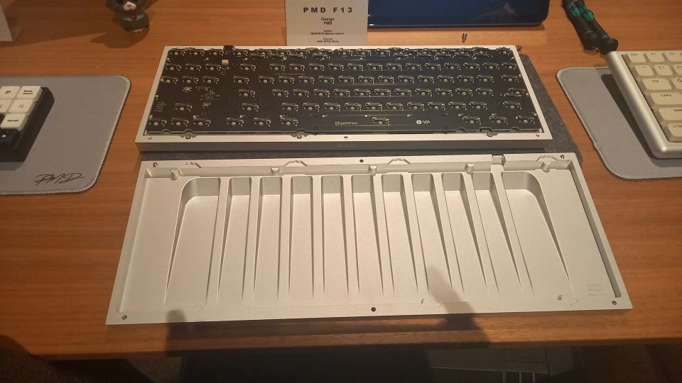 これメッシュサイズいくつ?って訊いたら250ですって返ってきてワロタ. キーボード文脈で聞いたことねえよ. この窪んだサイドプロファイルを目立たせるために光沢が必須(そうでないと陰で目立たなくなってしまう)で, かつマットな手触りにしたい, ということで250メッシュのアルマイトになったらしい.