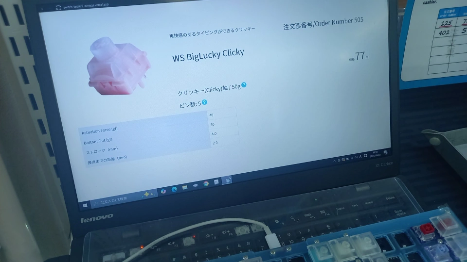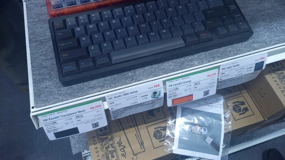 ここも随分久しぶりに来たので大分様変わりしていた. キースイッチの注文を番号でできるようになっていたり, サンプルビルドのキースイッチにもその番号が表示してあったり, レジでキースイッチを素早く数えるための道具が用意されていてスムーズに梱包・会計が行えるようになっていたりと色々便利になっていた.
