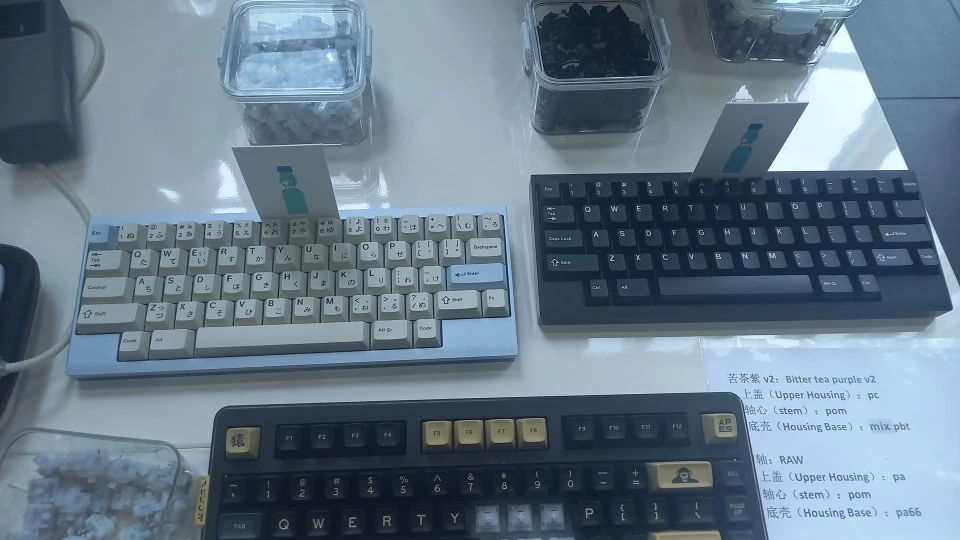 1セットも持っておらず, コミュニティで評価が割れている感じだったので実際に触って確認しにきた(天キーとかで触ったことはあるはずだけど注意して確認はしてなかった). 大分ザラザラしており, PBTのそれに近いというか, 会場の広さや喧騒から音で判別することは難しく表面の質感からこれABSなんだよな……?となっていた. これはまあ嫌いな人もいるだろうなという感じ. 個人的にどうなのかは実際使ってみないとよくわからない. 音が良ければ別にこんなもんでいい気はする.